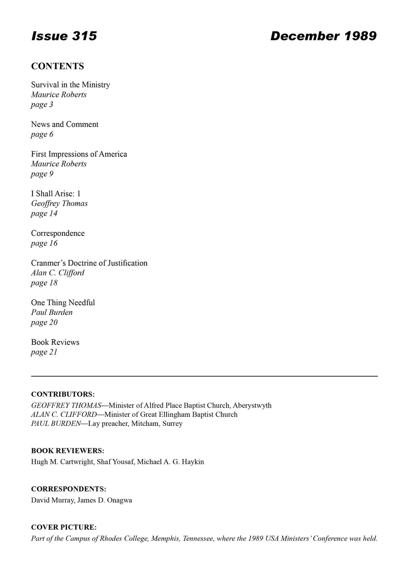 | I Shall Arise: Review of Life and Ministry of Donald A. MacFarlane (1) — Thomas, Geoffrey | 17-20 |