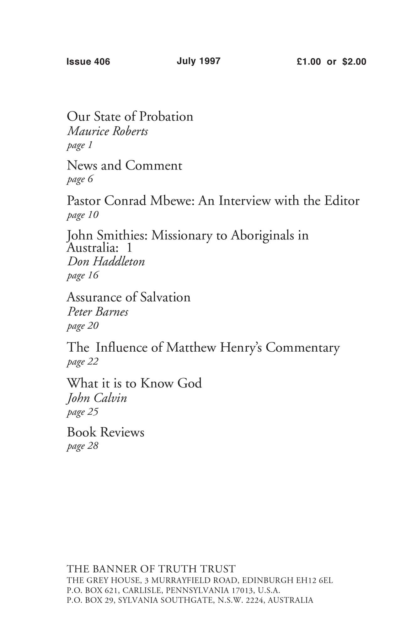 | Pastor Conrad Mbewe: An Interview with the Editor — Roberts, Maurice J | 10-15 |