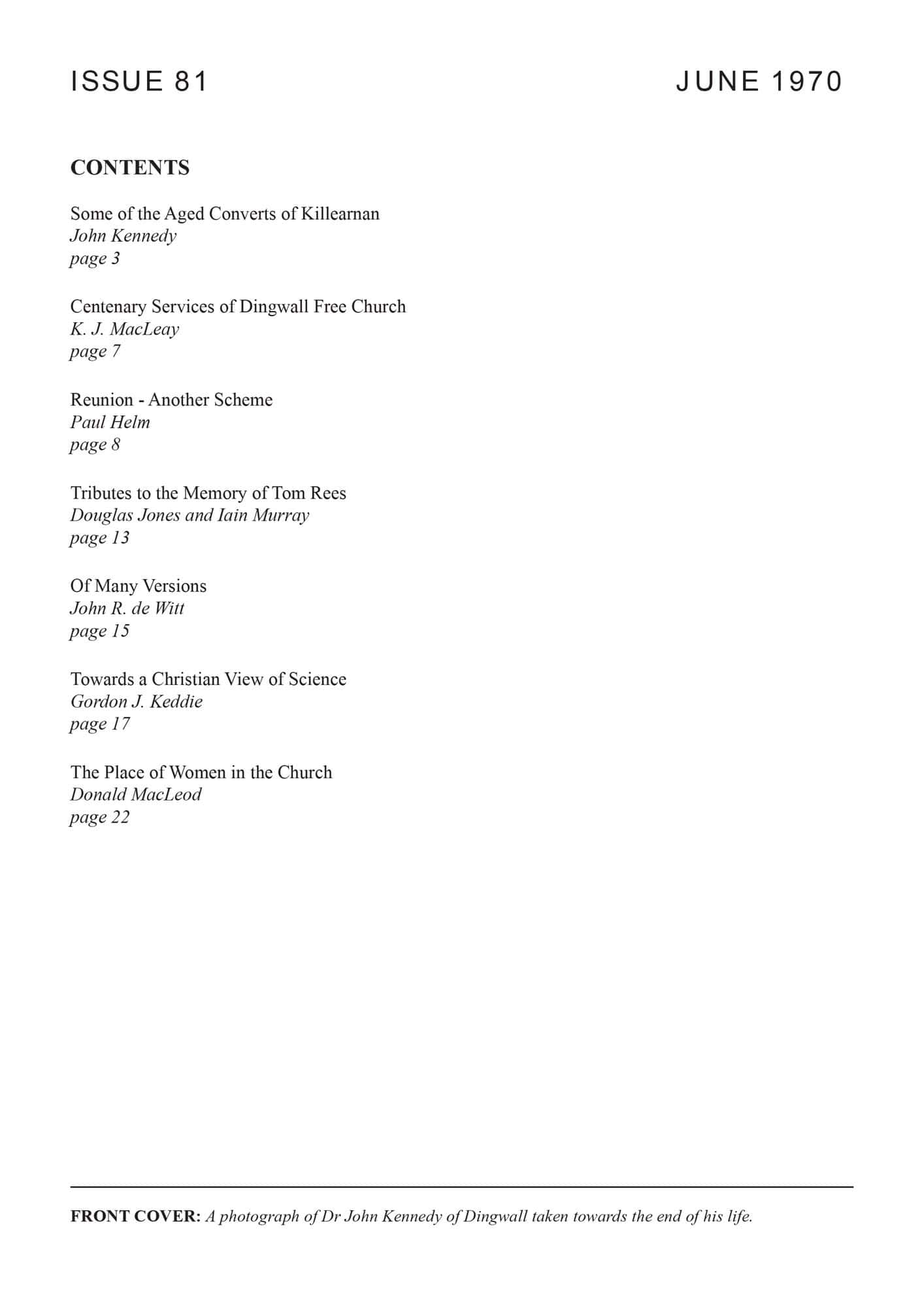 | Centenary Services of Dingwall Free Church 1970 — MacLeay, K J | 7-8 |