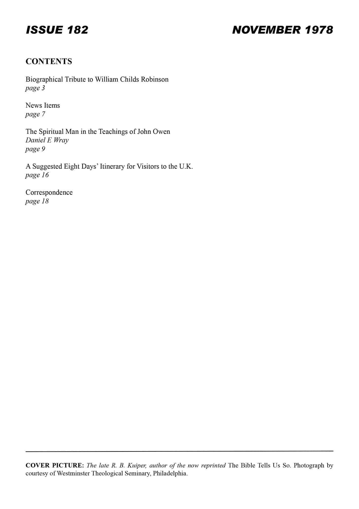 | Suggested Eight Days Itinerary for Visitors to UK — Murray, Iain H | 21-24 |