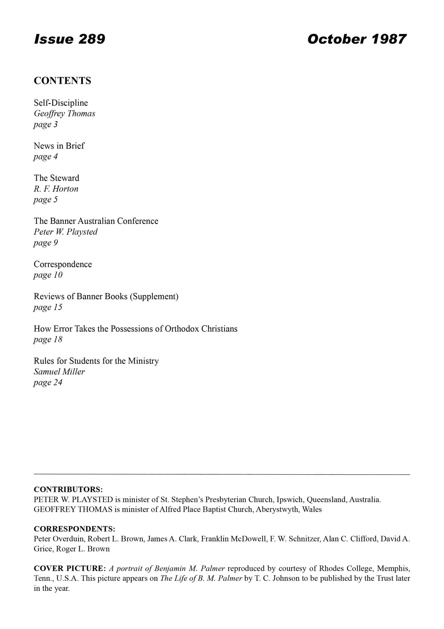 | Banner Australian Ministers Conference 1987 — Playsted, Peter W | 12-13 |