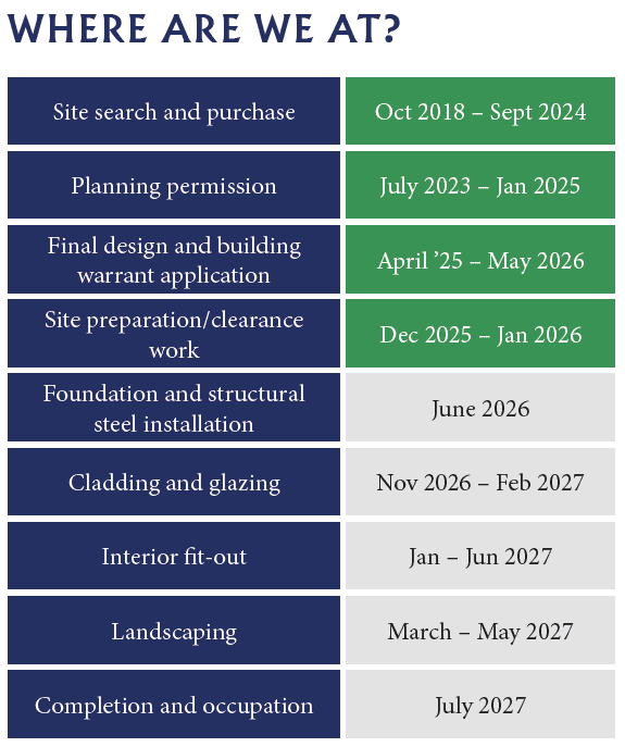 The table below highlights the key events of the project and estimated timeframes. Each box highlighted in green indicates a completed task.