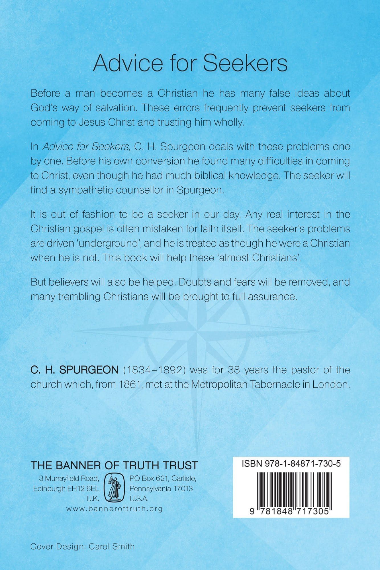 In Advice for Seekers C. H. Spurgeon deals with these problems one by one. Before his own conversion he found many difficulties in coming to Christ, even though he had much biblical knowledge. The seeker will find a sympathetic counsellor in Spurgeon.