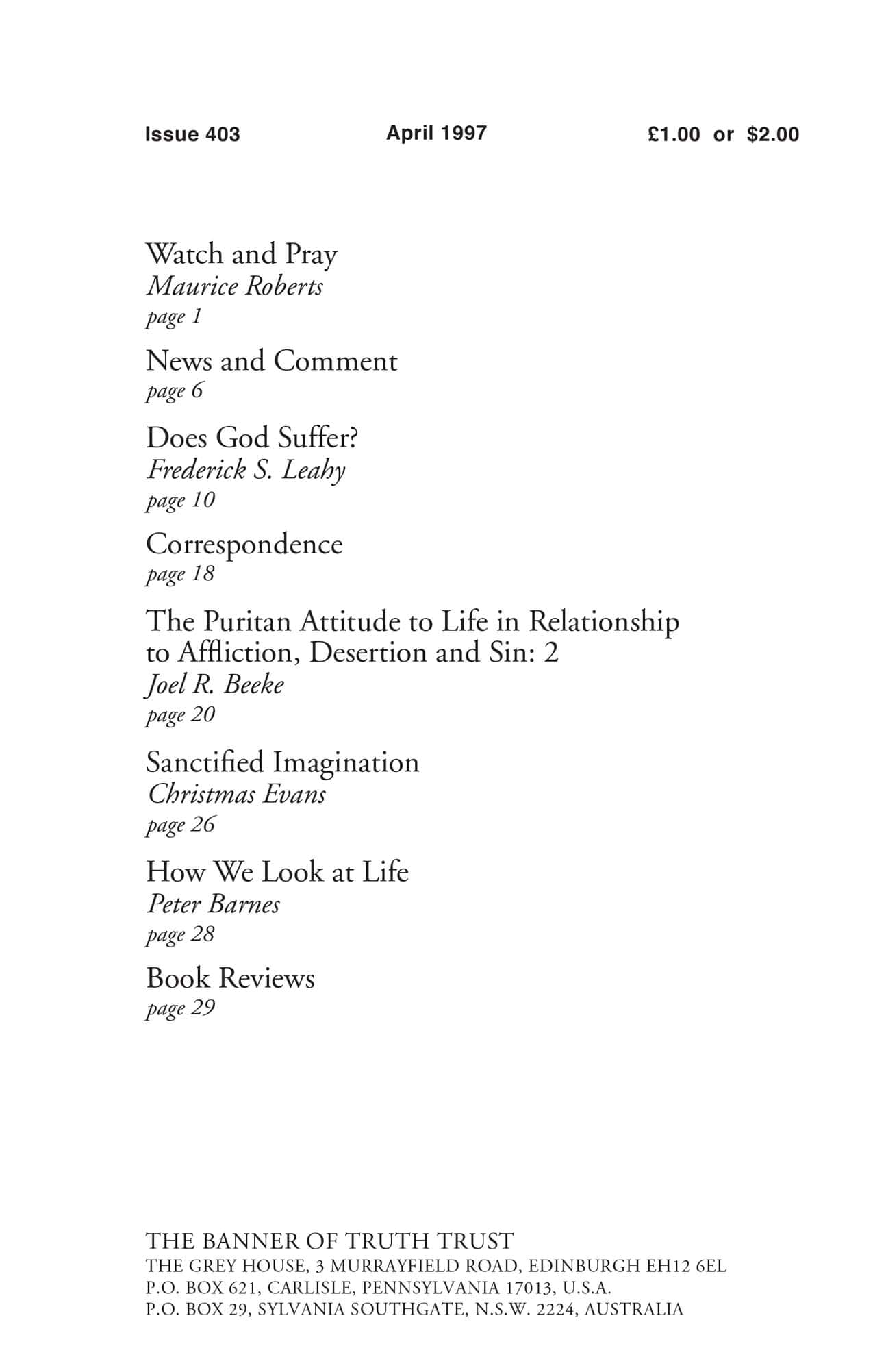 | Puritan Attitude to Life in Relationship to Affliction Desertion and Sin (2) — Beeke, Joel R | 20-25 |