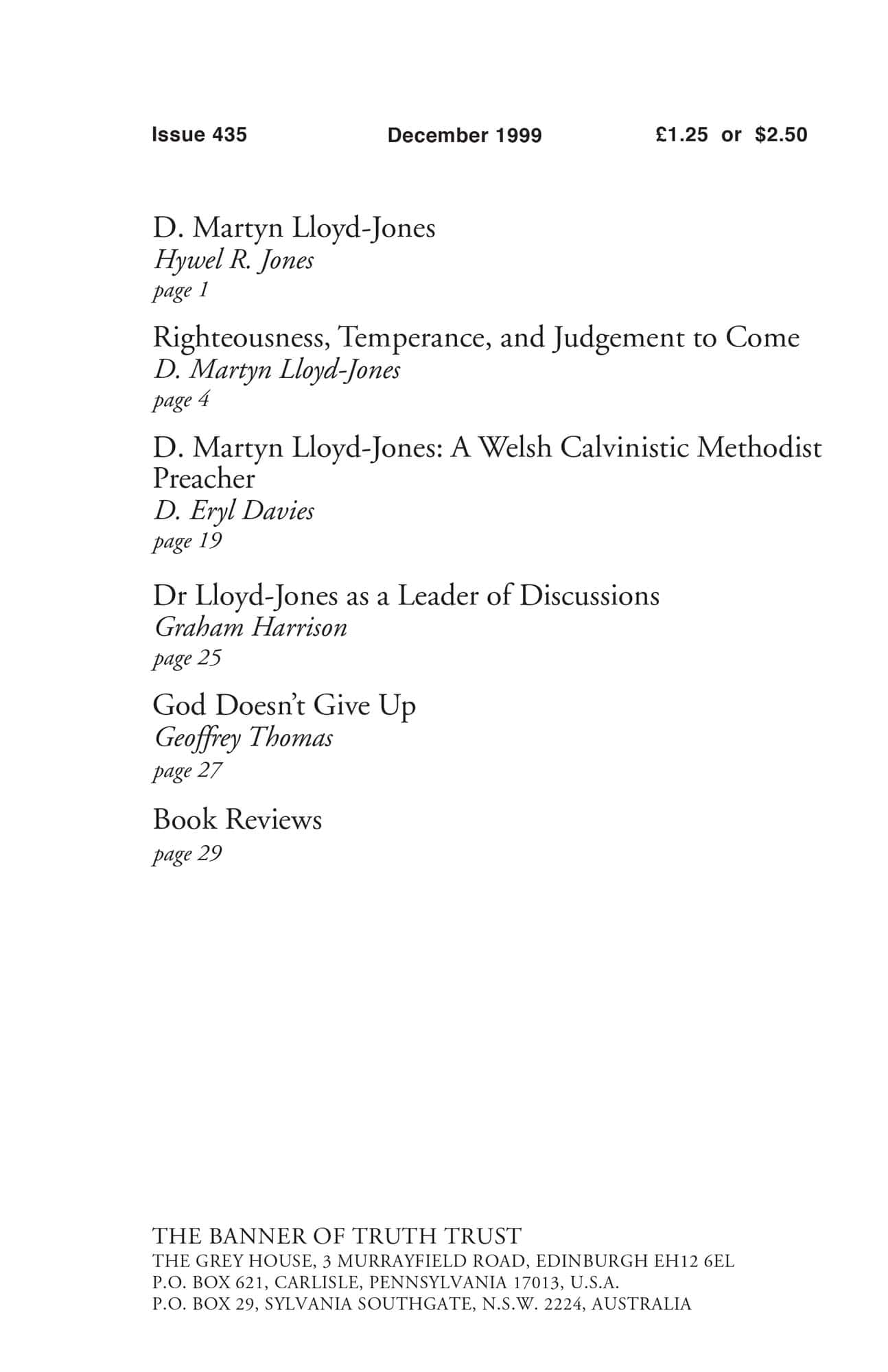 | D. Martyn Lloyd-Jones: A Welsh Calvinistic Methodist Preacher — Davies, D Eryl | 19-24 |