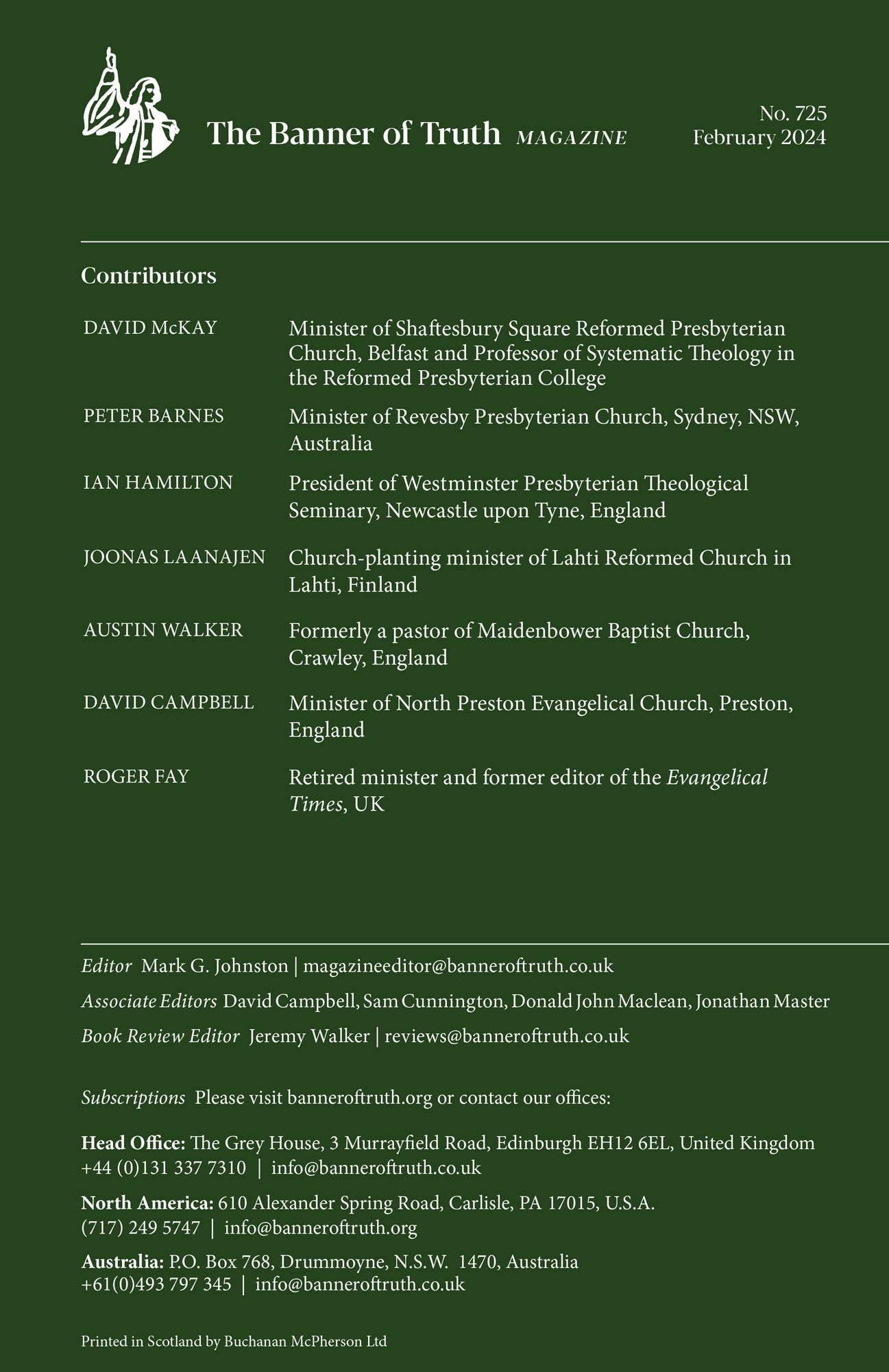 Table of Contents Is the Promised Blessing Withheld? , Charles Bridges News and Comment Evangelical Holiness: 3 , Iain H. Murray William (‘Bill’) Wenger, 1925, 2013 – Walter J. Chantry Anne Pearce Kinkead (Mrs B. B. Warfield), 1852, 1915 , Fred G. Zaspel Truth Is Offensive , Peter Barnes Book Review