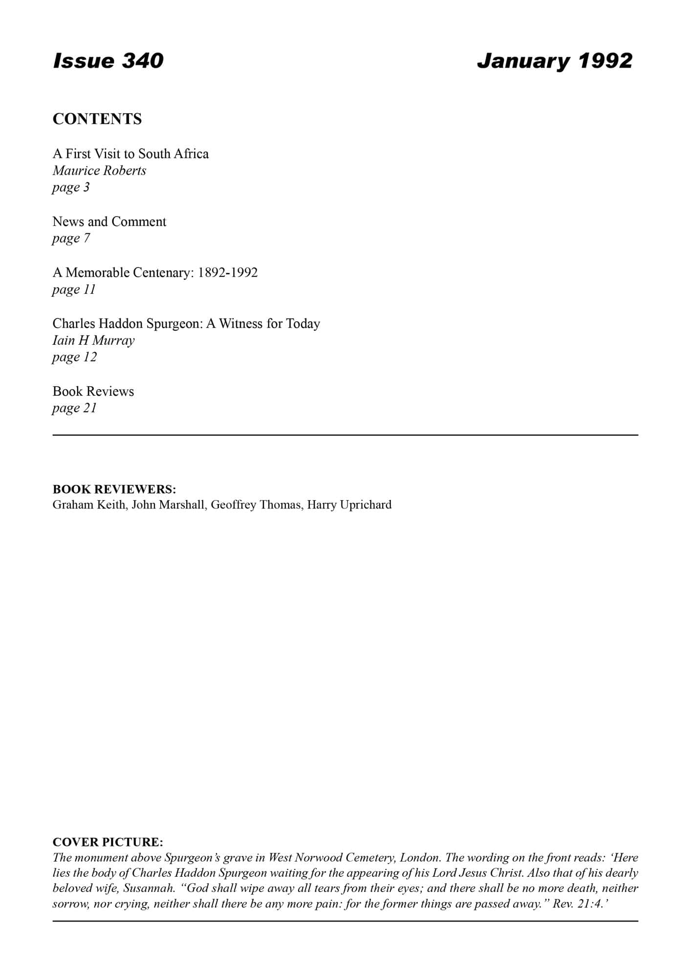 | Memorable Centenary: 1892-1992 — Spurgeon, C H | 12-13 |