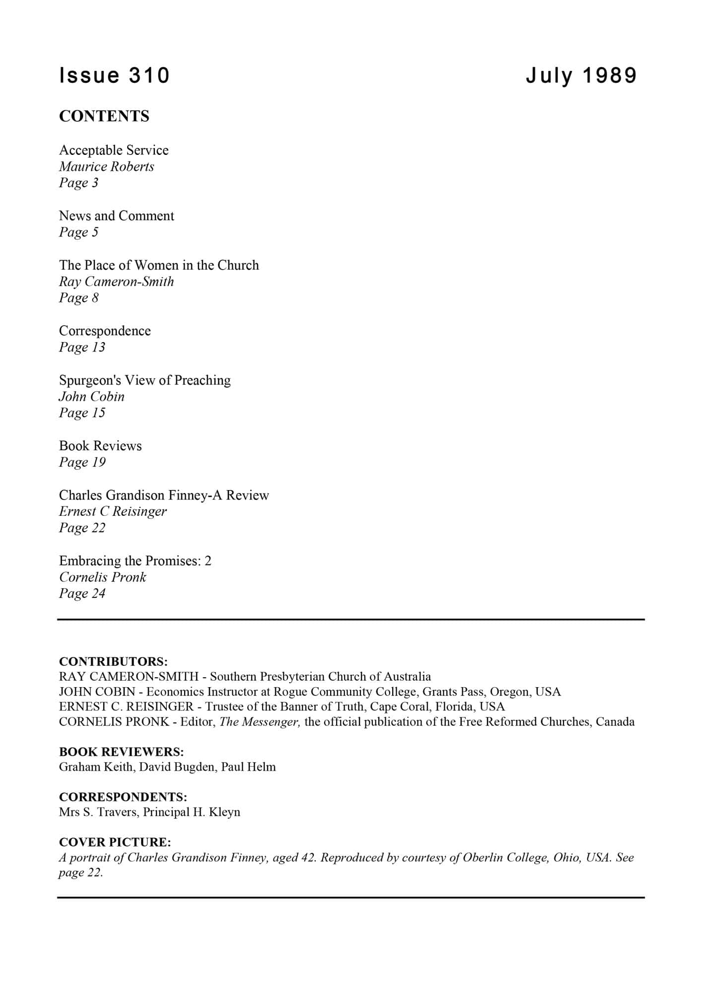 | Charles Grandison Finney Revivalist and Reformer 1792-1875: Review Article of book by Keith J. Hardman — Reisinger, Ernest C | 27-29 |