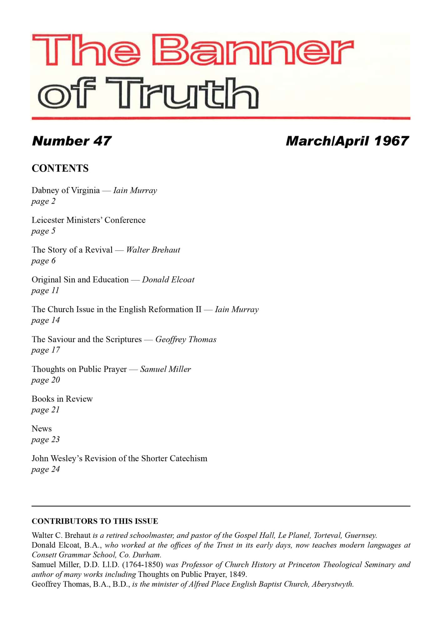 Subscribe to the Banner of Truth Magazine for 11 edifying issues each year (including summer double issue). Table of Contents O Jerusalem, Jerusalem — Thomas, Geoffrey 1-5 Changing Scene in the United States — Murray, Iain H 10-16 Zeal to Promote the Common Good – The Story of the King James Bible – 1 — […]
