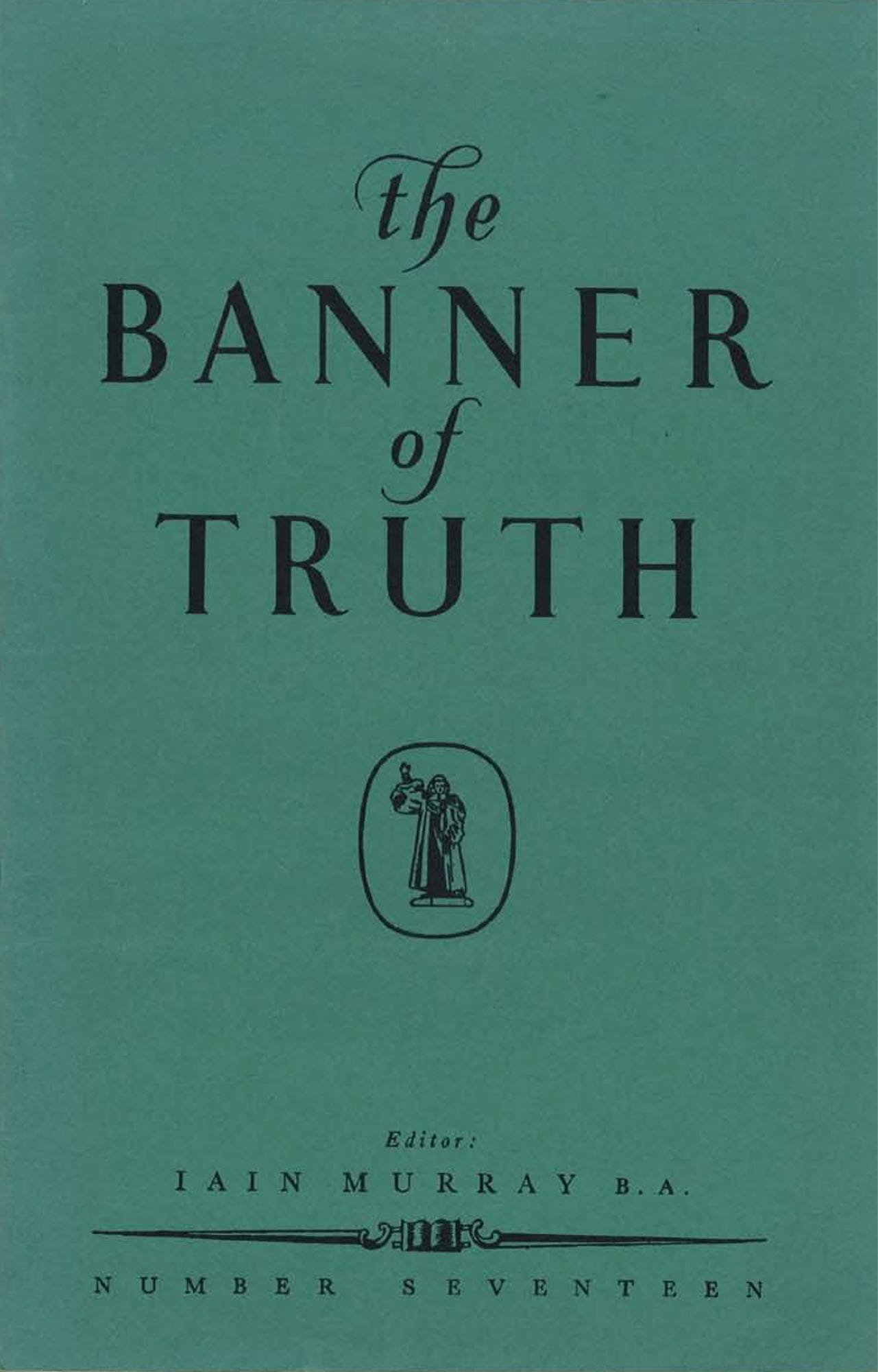 This binder holds two years’ issues and is made of stout board, with wire rods to hold the magazine in place. The name ‘Banner of Truth’ is stamped in gold on a black panel on the grey cloth.